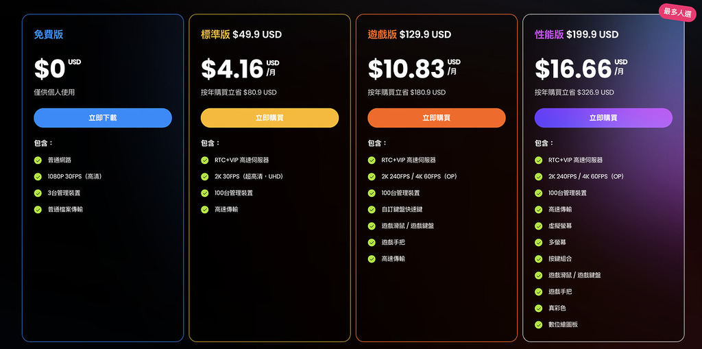 - 性能版:針對設計師、剪輯師、工程師或遠端維修人員,支援多螢幕及虛擬螢幕,適合長時間、高畫質的遠端工作。