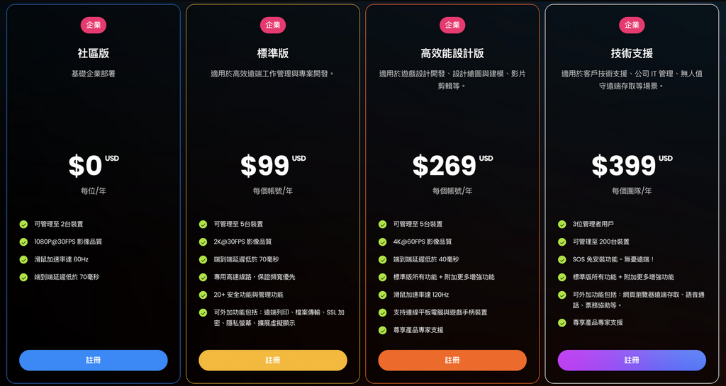 - 性能版:針對設計師、剪輯師、工程師或遠端維修人員,支援多螢幕及虛擬螢幕,適合長時間、高畫質的遠端工作。