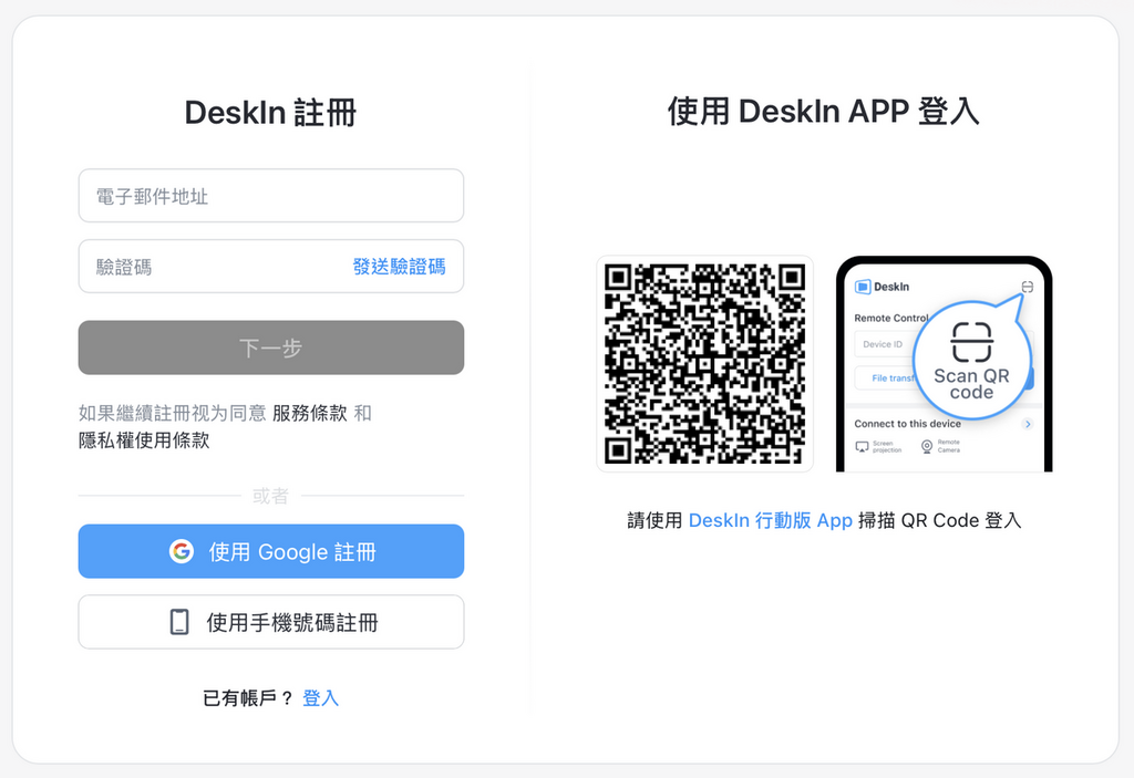 - 於家用 PC 裝好 DeskIn,登入帳戶。