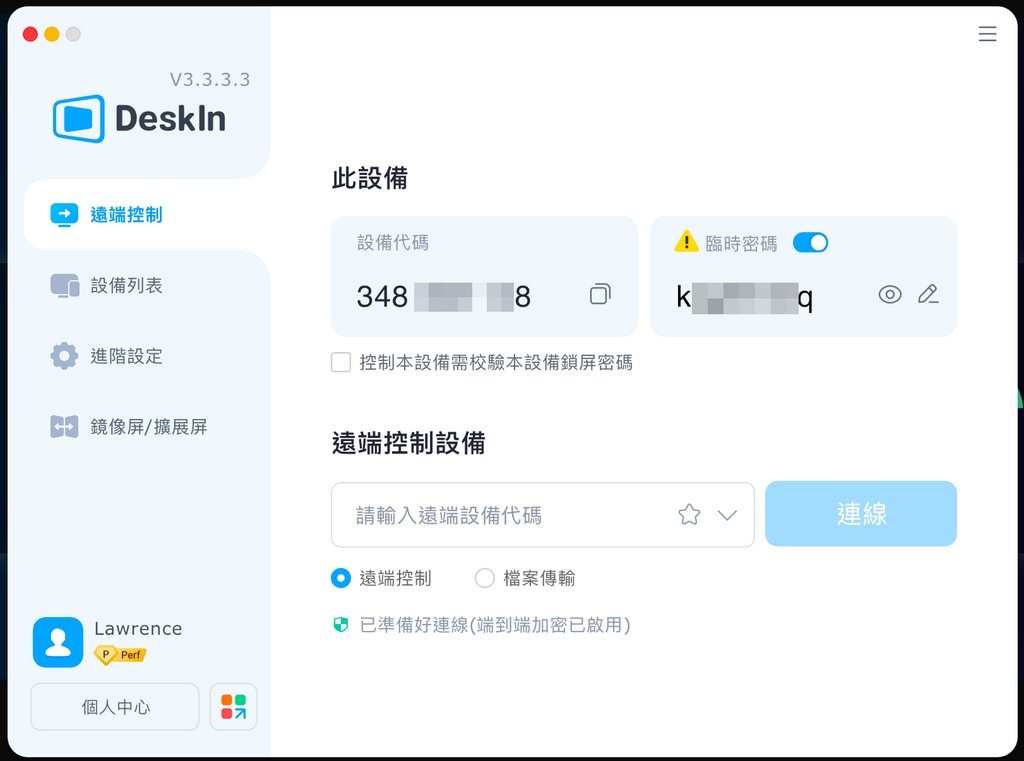 - 如裝置是自己使用,可以先在公司 Windows 電腦中,在 DeskIn 的 「進階設定」> 「安全設定」中,將驗證方式由臨時密碼,改成安全密碼,以後就可以用同一個密碼來登入,不用每次授權。