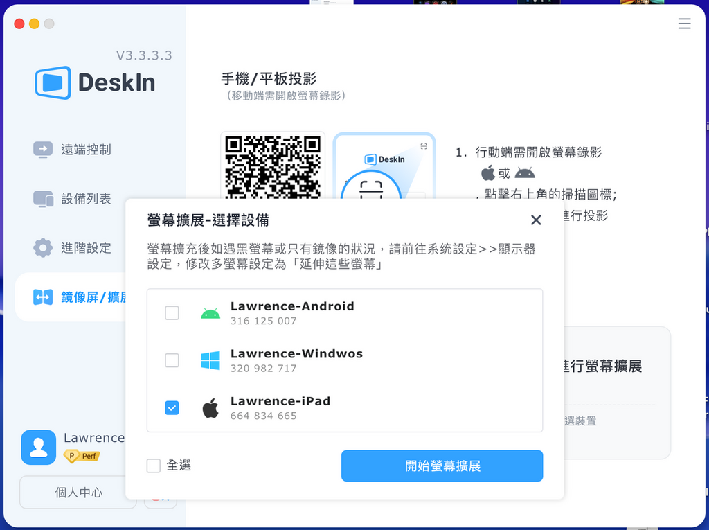 - 在 PC 端「鏡像屏/擴展屏」功能下,選擇啟動螢幕擴展,再以 iPad 作為目標裝置。