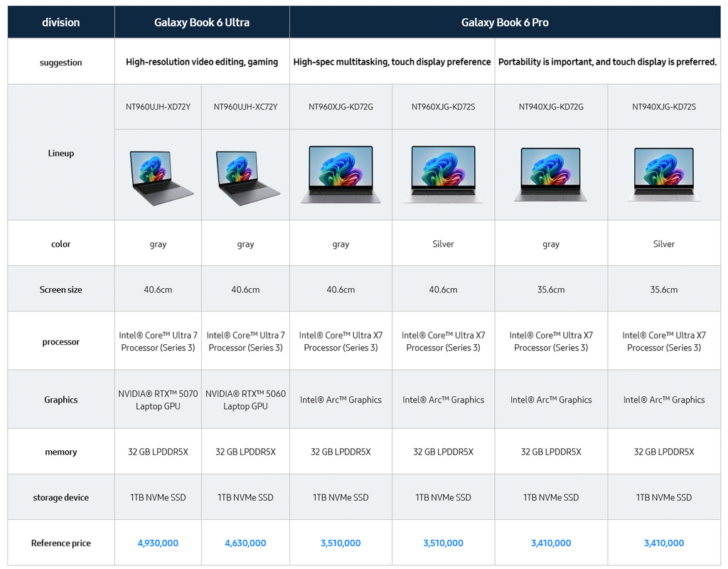 Samsung Galaxy Book 6 Pro 和 Ultra 筆電全數都配備 32GB DDR5 記憶體和 1TB SSD,加上新的 Core Ultra (Series 3) 處理器,所以有理由加價 20%,上表參考價錢以韓元為單位,兌港幣後約 18,055 至 26,104 港元之間 。